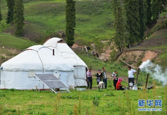 7月15日,在新疆伊犁尼勒克縣烏拉斯臺(tái)鄉(xiāng)闊克鐵列克村布隆溝,26歲的布力布力(抱小孩者)同家人一起在自家氈房里看電視。自2013年12月份以來(lái),國(guó)電新疆電力有限公司免費(fèi)為新疆伊犁的6410戶無(wú)電戶發(fā)放光伏發(fā)電系統(tǒng)設(shè)備,解決了當(dāng)?shù)?8000多無(wú)電人口的用電問(wèn)題。發(fā)放的光伏發(fā)電設(shè)