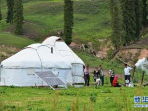 7月15日,在新疆伊犁尼勒克縣烏拉斯臺(tái)鄉(xiāng)闊克鐵列克村布隆溝,26歲的布力布力(抱小孩者)同家人一起在自家氈房里看電視。自2013年12月份以來(lái),國(guó)電新疆電力有限公司免費(fèi)為新疆伊犁的6410戶無(wú)電戶發(fā)放光伏發(fā)電系統(tǒng)設(shè)備,解決了當(dāng)?shù)?8000多無(wú)電人口的用電問(wèn)題。發(fā)放的光伏發(fā)電設(shè)備具有就地建設(shè)、獨(dú)立供電的特點(diǎn),以及方便實(shí)用、節(jié)能環(huán)保的優(yōu)點(diǎn),可同時(shí)為照明、電視、電冰箱等家用電器提供電源。