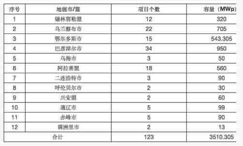 2013年11月7日,內(nèi)蒙古自治區(qū)發(fā)展和改革委員會(huì)下發(fā)《關(guān)于我區(qū)太陽(yáng)能發(fā)電項(xiàng)目試行盟市備案管理的通知》,文件提出當(dāng)時(shí)已經(jīng)核準(zhǔn)或者拿到路條的項(xiàng)目等同備案,這些項(xiàng)目的分布情況如下表所示。