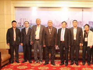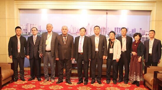 罕默朵夫•阿赫默樟(左4)、伊斯莫伊洛夫•哈比布洛(左2)以及兩國政府代表團(tuán)成員與商博會(huì)組委會(huì)領(lǐng)導(dǎo)合影 罕默朵夫•阿赫默樟介紹,吉爾吉斯斯坦一直以水力發(fā)電為主,而今年能源不足,所以現(xiàn)在比較傾向于別的清潔能源。