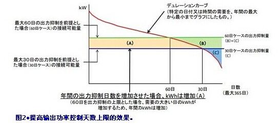 加上若調(diào)整以每年30天為上限的輸出功率控制規(guī)則,增加上限天數(shù),并將輸出功率控制對象擴(kuò)大至不足500kW的光伏及風(fēng)力發(fā)電,則有可能增加可并網(wǎng)量(kW)(圖2)。