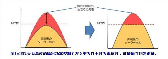 根據(jù)目前基于可再生能源電力固定價格收購制度(FIT)的規(guī)則,電力公司對輸出功率在500kW以上的可再生能源發(fā)電設(shè)備,每年可要求無補(bǔ)償輸出功率控制的天數(shù)在30天以下。此時的輸出功率控制基本世以天數(shù)來管理的。但光伏及風(fēng)力發(fā)電量在1天內(nèi)(24小時)都超出需求的可能性不大。如果改為僅在超出需求的時段控制輸出功率,則可增加并網(wǎng)發(fā)電量(kWh)(圖1)。