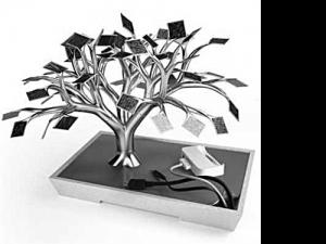 太陽能充電樹的外形酷似一棵盆栽的小樹,它的底部是瓷質(zhì)花盆,樹干可以隨意旋轉(zhuǎn),樹葉則是若干光伏面板,其傾斜角度可以改變。在接受太陽光的照射后,這些太陽能板就會將太陽能轉(zhuǎn)化成電能存儲在花盆內(nèi),用來給手機(jī)、數(shù)碼相機(jī)等移動設(shè)備充電。由于電池容量較大,所以太陽能充電樹需要在陽光下曬上總計約36個小時才能充滿電。