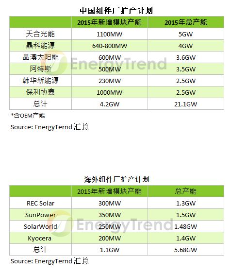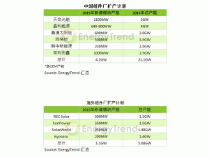 2015年,全球太陽能需求將達(dá)到51.4GW,年成長16.5%,預(yù)計(jì)將比今年增加7GW的安裝量。從供給端來看,TrendForce旗下新能源事業(yè)處EnergyTrend發(fā)現(xiàn),2015年中國廠商已宣布擴(kuò)產(chǎn)計(jì)劃,將新增4.2GW組件產(chǎn)能,占全球需求的8.2%;至于海外組件廠將擴(kuò)增1.1GW的產(chǎn)能