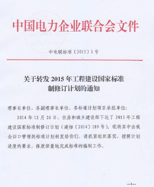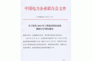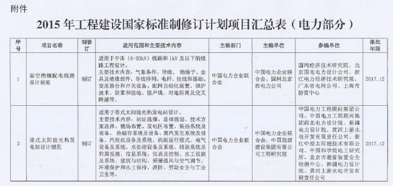 2014年12月26日,住房和城鄉(xiāng)建設(shè)部下達(dá)了2015年工程建設(shè)國(guó)家標(biāo)準(zhǔn)修訂計(jì)劃(建標(biāo)【2014】189號(hào))。上述中電聯(lián)發(fā)布的為其中涉及電力行業(yè)的相關(guān)標(biāo)準(zhǔn)?偣舶芸战^緣配電線路設(shè)計(jì)規(guī)范、塔式太陽(yáng)能光熱發(fā)電站設(shè)計(jì)規(guī)范、海上風(fēng)電場(chǎng)工程勘測(cè)規(guī)范、電力建設(shè)電纜工程設(shè)計(jì)規(guī)范共四項(xiàng)標(biāo)準(zhǔn)的新制定和修訂工作。