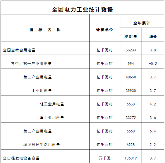 2014年,全社會用電量55233億千瓦時,同比增長3.8%。分產(chǎn)業(yè)看,第一產(chǎn)業(yè)用電量994億千瓦時,同比下降0.2%;第二產(chǎn)業(yè)用電量40650億千瓦時,同比增長3.7%;第三產(chǎn)業(yè)用電量6660億千瓦時,同比增長6.4%;城鄉(xiāng)居民生活用電量6928億千瓦時,同比增長2.2%。