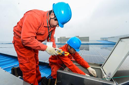 1月29日,浙江德清縣供電公司工作人員檢查已經(jīng)并網(wǎng)的天馬重工機械有限公司廠區(qū)光伏屋頂。