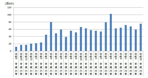 按月的光伏發(fā)電開(kāi)始運(yùn)轉(zhuǎn)量走勢(shì)(出處:經(jīng)濟(jì)產(chǎn)業(yè)省)