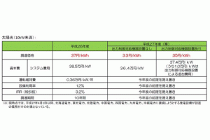 委員長草案中的收購價格為,10kW以上的光伏發(fā)電在4月1日~6月30日期間為29日元/kWh,在7月~2016年3月期間為27日元/kWh。10kW以下的住宅用光伏發(fā)電系統(tǒng),在無需設置輸出控制設備的東京電力、中部電力和關西電力管下為33日元/kWh,在必須設置輸出控制設備的其他電力公司管內為35日元/kWh。