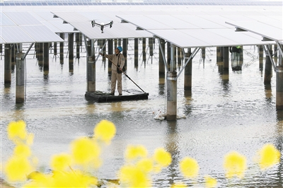 4月15日,無(wú)人飛機(jī)在江蘇省泰州市一水上太陽(yáng)能發(fā)電站巡檢設(shè)備。新華社發(fā)(湯德宏 攝)