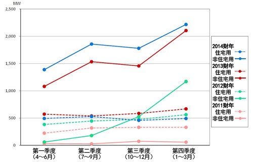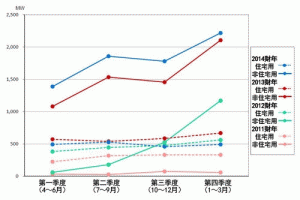 2014財年住宅領(lǐng)域和非住宅領(lǐng)域的日本出貨量分別為1.97GW和7.24GW。上財年這兩個領(lǐng)域的出貨量分別為2.36GW和6.17GW,因此住宅領(lǐng)域雖減少了16.5%,但非住宅領(lǐng)域增加了17.3%?芍亲≌I(lǐng)域的增長推動了整體的增長。住宅領(lǐng)域的出貨量減少,有隨著消費稅的上漲,住宅的開工建設(shè)數(shù)量減少等原因。