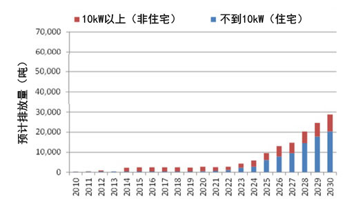 報告稱,因固定價格收購制度(FIT)光伏發(fā)電設(shè)備激增的結(jié)果是,太陽能電池板的廢置量,在壽命為25年的情況下,預(yù)計2020年度約為3000噸,2030年度約為3萬噸,2040年度約為80萬噸。