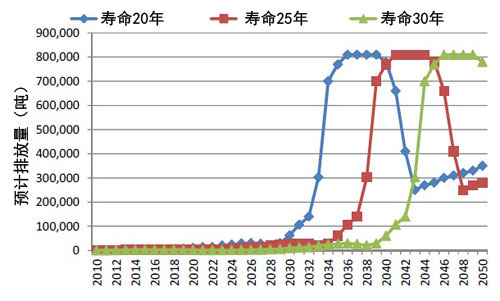 太陽能電池面板預(yù)計廢置量。壽命為20、25、30年時(出處:環(huán)境。 電池板含有的銀、銅等有用物質(zhì),在去除玻璃后可由冶煉企業(yè)回收利用,但得知,回收利用的成本超過了資源價值。而且,在作掩埋處理時,重金屬等可能會溶出,因此最理想的方式,是讓電池板廠商參與回收利用,促使其采用環(huán)保設(shè)計。