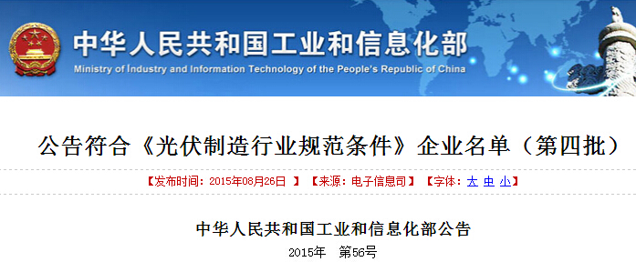 按照《國(guó)務(wù)院關(guān)于促進(jìn)光伏產(chǎn)業(yè)健康發(fā)展的若干意見》的要求,根據(jù)《光伏制造行業(yè)規(guī)范條件》(2015年本)及《光伏制造行業(yè)規(guī)范公告管理暫行辦法》,經(jīng)企業(yè)申報(bào)、省級(jí)工業(yè)和信息化主管部門核實(shí)推薦、專家復(fù)核、網(wǎng)上公示及現(xiàn)場(chǎng)抽檢,現(xiàn)將符合《光伏制造行業(yè)規(guī)范條件》企業(yè)名單(第四批)予以公告。