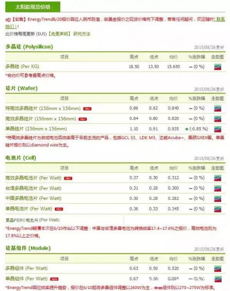 電池片部分,臺灣電池?fù)碛休^高效率的優(yōu)勢,目前仍不畏人民幣貶值效應(yīng),九月計劃持續(xù)拉抬電池片價格,預(yù)期九月臺灣轉(zhuǎn)換效率17.8%以上的電池片均價將能站穩(wěn)US$0.32 / watt的水位。中國高效電池片價格目前則持穩(wěn)在RMB 2.19~2.23 / watt之間,并同樣預(yù)期九月能有小幅上漲。