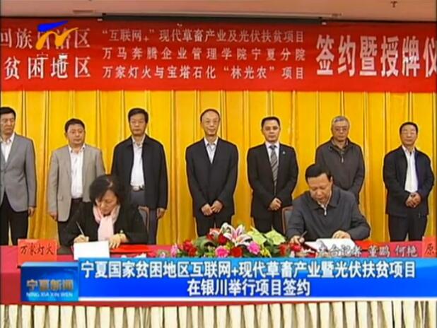 10月10日,由自治區(qū)扶貧基金會(huì)引進(jìn)的“寧夏回族自治區(qū)國家貧困地區(qū)‘互聯(lián)網(wǎng)+’現(xiàn)代草畜產(chǎn)業(yè)暨光伏扶貧項(xiàng)目”在銀川市簽約。該項(xiàng)目由萬家燈火網(wǎng)絡(luò)技術(shù)有限責(zé)任公司計(jì)劃總投資近95億元,達(dá)產(chǎn)后將實(shí)現(xiàn)年屠宰加工6.5萬頭肉牛、120萬只肉羊、農(nóng)業(yè)設(shè)施光伏年發(fā)電量4億千瓦時(shí)的目標(biāo)。儀式上,該公司分別與固原市原州區(qū)政府和吳忠市孫家灘國家農(nóng)業(yè)