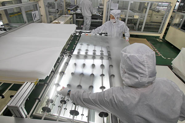 2013年3月26日,江蘇南通一家新能源企業(yè)工作人員在組件車間進行太陽能光伏組件封裝。視覺中國 圖