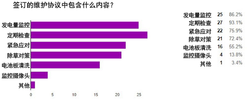 對(duì)“簽訂的維護(hù)協(xié)議中包括什么內(nèi)容”的提問(wèn),回答“定期檢查”的最多,為93.1%。其次是“發(fā)電量監(jiān)控”,為86.2%,“緊急應(yīng)對(duì)”和“除草對(duì)策”等為70%以上!半姵匕迩逑础睘55.2%。