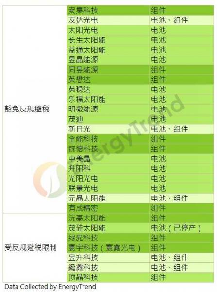 此外,同時公告豁免的馬來西亞廠商為:AUO-SunPower Sdn. Bhd、Flextronics Shah Alam SDN, Bhd、Hanwha Q CELLS Malaysia Sdn. Bhd.、Panasonic Energy Malaysia Sdn. Bhd、TS Solartech Sdn. Bhd。