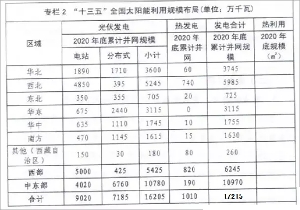 對于結(jié)構(gòu)指標(biāo),意見稿指出到2020年底,太陽能發(fā)電裝機規(guī)模在電力結(jié)構(gòu)中的比重約7%,在新增電力裝機結(jié)構(gòu)中的比重約15%,在全國總發(fā)電量結(jié)構(gòu)中的比重約2.5%,折合標(biāo)煤量約5000萬噸,約占能源消費總量比重的1%,為15%非化石能源比重目標(biāo)的實現(xiàn)提供支撐。在太陽能發(fā)電總裝機容量中,光伏發(fā)電占比94%,光熱發(fā)電占比6%,西部地區(qū)占太陽能發(fā)電總裝機容量的35%,中東部地區(qū)占比65%。