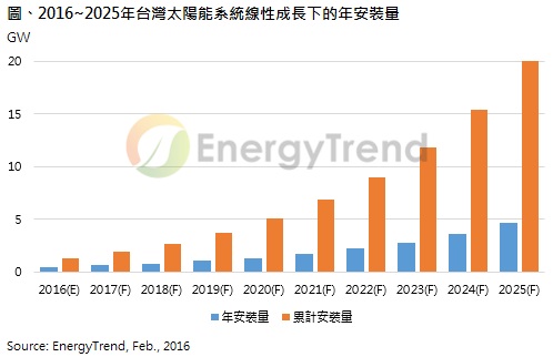 臺(tái)灣地區(qū)新政府發(fā)展太陽(yáng)能態(tài)度積極,2025年全臺(tái)安裝目標(biāo)傳將由原先的13GW向上提高至20GW。TrendForce旗下綠能事業(yè)處EnergyTrend表示,截至2015年10月止,臺(tái)灣太陽(yáng)能安裝量累計(jì)共728MW,如以線(xiàn)性成長(zhǎng)并且在2025年達(dá)到20GW,年安裝量的復(fù)合成長(zhǎng)率(CAGR)需維持28%長(zhǎng)達(dá)10年,且末2~3年需安裝超過(guò)3GW至4GW,比照過(guò)去兩年安裝量各約220MW出頭,需配合完善配套措施才可望達(dá)成。