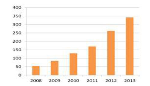 東京都內(nèi)光伏發(fā)電設(shè)備變化情況(單位:千kW)(出處:東京都) 東京都內(nèi)的可再生能源電力比例,2014年度只占用電量的約8.7%。但隨著固定價格收購制度(FIT)的實施,近年來光伏發(fā)電大幅增長,2013年度實際約為35萬kW,增至2008年度的約6倍。此次的報告提出了2030年之前在東京都內(nèi)導(dǎo)入130萬kW(1.3GW)光伏發(fā)電設(shè)備的目標(biāo)。