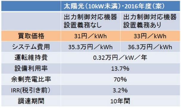 在委員長(zhǎng)草案中,10kW以上商用光伏發(fā)電的價(jià)格為24日元/kWh(不含稅,下同)。而關(guān)于不足10kW的住宅用光伏發(fā)電,在無(wú)需設(shè)置輸出功率控制設(shè)備的東京電力、中部電力、關(guān)西電力轄區(qū)為31日元/kWh;必須設(shè)置該設(shè)備的其他電力公司轄區(qū)為33日元/kWh。