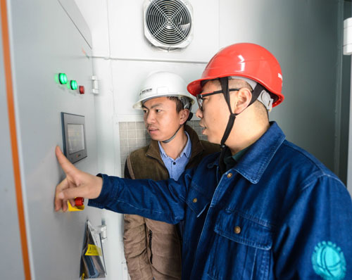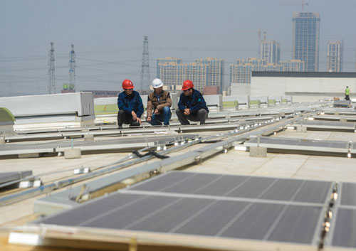 3月15日,工作人員在查看杭州余杭區(qū)長江汽車有限公司屋頂光伏發(fā)電設(shè)備的并網(wǎng)發(fā)電運行情況。新華社記者 徐昱 攝
