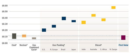 美國太陽能電池廠商First Solar在其2016年3月出版的《第一太陽能2015年可持續(xù)性報告》中公布,目前采用該公司太陽能電池的光伏發(fā)電設(shè)施的發(fā)電成本,“已達(dá)到可與化石燃料等發(fā)電成本競爭的水平”。