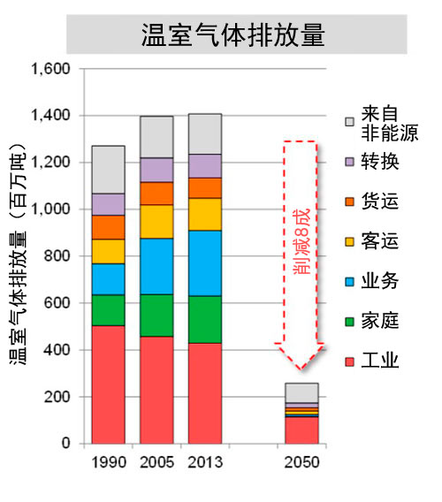 “2030年減少26%”是日本向聯(lián)合國氣候變化框架公約秘書處提出的“約定草案”目標。“2050年減少80%”則是在2009年的拉奎拉峰會上,就“2050年將全球溫室氣體減少一半,發(fā)達國家整體減少80%以上”達成一致等,正逐漸成為國際共識的目標。