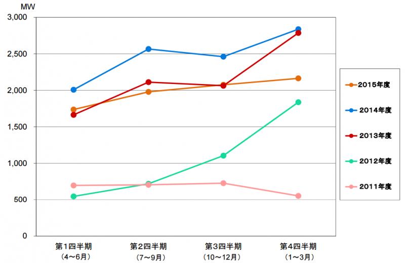 2015財年全年,日本廠商太陽能組件總發(fā)貨量下跌,低于2014年的高峰期,也較2013年更少。全年組件發(fā)貨量7,956MW,為2014年的81%,反映了19%下跌。