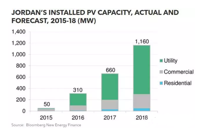以下是我們獲得的幾組數(shù)據(jù): ● 到2016年底,約旦的光伏裝機容量預(yù)計將達310MW,而這一數(shù)字在2015年僅為50MW。