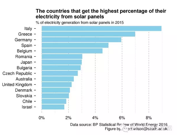 但是,如果我們從各國(guó)光伏發(fā)電占總發(fā)電量的比例來(lái)看,2015年意大利光伏發(fā)電占總發(fā)電量比例接近9%,這個(gè)比例在世界上名列前茅。2015年光伏發(fā)電比例排在前十名的其他國(guó)家是希臘(約7%)、德國(guó)(約6%)、西班牙(約5%)、比利時(shí)(約4.5%)、羅馬尼亞(約3%)、日本(約3%)、保加利亞(約3%)、捷克(約2.7%)、澳大利亞(約2.5%)。