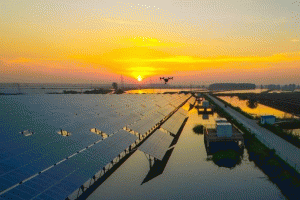 2016年8月23日,無(wú)人機(jī)正在華東最大的水上光伏發(fā)電基地,位于江蘇興化李中鎮(zhèn)蘇宋村的華電(興化)太陽(yáng)能發(fā)電項(xiàng)目檢查光伏設(shè)備運(yùn)行情況。江蘇省泰州市打造國(guó)家級(jí)清潔能源保障供應(yīng)基地,以光伏、儲(chǔ)能、新能源裝備制造為重點(diǎn)發(fā)展方向,堅(jiān)持產(chǎn)業(yè)集聚與研發(fā)引領(lǐng)同步推進(jìn),形成產(chǎn)業(yè)鏈完整、創(chuàng)新能力強(qiáng)、具有核心競(jìng)爭(zhēng)力的三大產(chǎn)業(yè)集群,力爭(zhēng)2017年基本建成集交易中心、研發(fā)中心、太陽(yáng)能組配件集散中心、信息發(fā)布中心為一體的國(guó)家千億級(jí)新能源特色產(chǎn)業(yè)基地。目前已建起屋頂光伏電站、農(nóng)業(yè)大棚光伏電站和魚(yú)塘水面光伏電站共計(jì)330座(戶(hù)),總裝機(jī)容量為31萬(wàn)千瓦,年累計(jì)發(fā)電225444萬(wàn)千瓦時(shí)。