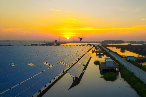 2016年8月23日,無(wú)人機(jī)正在華東最大的水上光伏發(fā)電基地,位于江蘇興化李中鎮(zhèn)蘇宋村的華電(興化)太陽(yáng)能發(fā)電項(xiàng)目檢查光伏設(shè)備運(yùn)行情況。