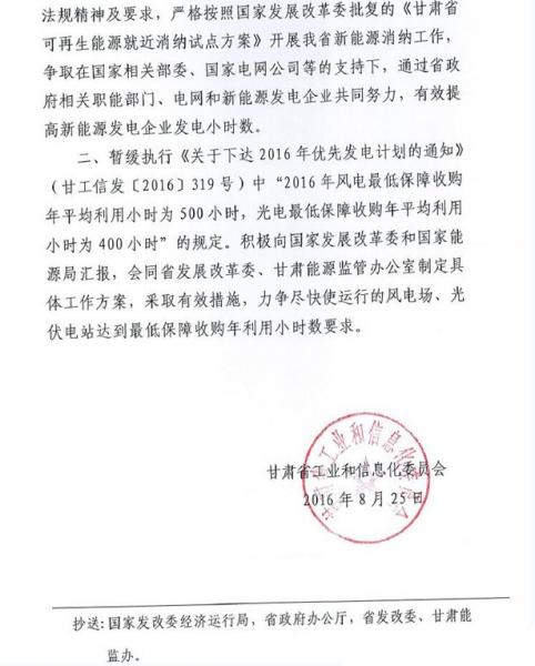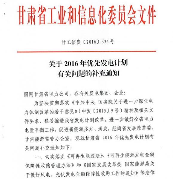 2016年8月25日,甘肅省工業(yè)和信息化委員會(huì)發(fā)布了名為《關(guān)于2016年優(yōu)先發(fā)電計(jì)劃有關(guān)問(wèn)題的補(bǔ)充通知》,通知指出,將暫緩執(zhí)行《甘肅省工業(yè)和信息化委員會(huì)關(guān)于下達(dá)2016年優(yōu)先發(fā)電計(jì)劃的通知》(甘工信發(fā)[2016]319號(hào))中提出的“2016年風(fēng)電最低保障收購(gòu)年平均利用小時(shí)為500小時(shí),光電最低保障收購(gòu)年平均利用小時(shí)為400小時(shí)!钡囊(guī)定。