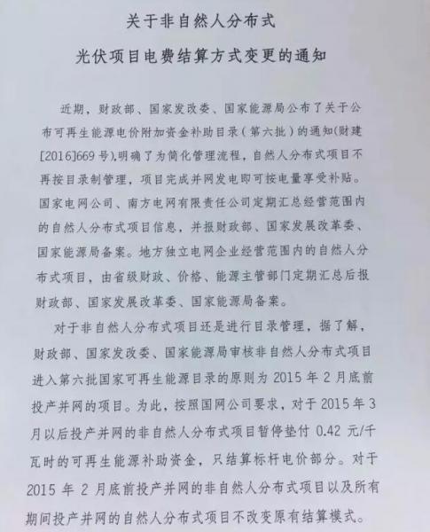 無(wú)錫電力公司分管分布式業(yè)務(wù)相關(guān)人士表示:“很遺憾,在新能源大會(huì)即將召開的前夕,跟大家宣布這樣的消息,2015年3月1日及以后并網(wǎng)項(xiàng)目(企業(yè)類),補(bǔ)貼暫停墊付,待國(guó)家宣布新一批目錄后再根據(jù)目錄中項(xiàng)目進(jìn)行墊付,從2016年9月開始執(zhí)行,本月開始開展已開9月票據(jù)善后工作,請(qǐng)各位企業(yè)家朋友周知配合”。