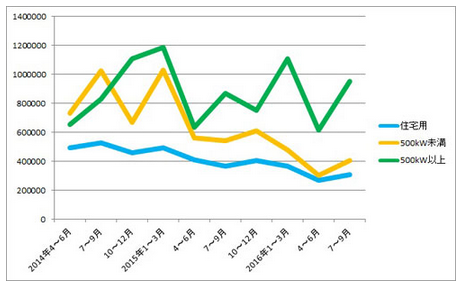 日本光伏發(fā)電協(xié)會(huì)(JPEA)11月24日公布了2016年7~9月日本太陽(yáng)能電池板國(guó)內(nèi)出貨量統(tǒng)計(jì)值:住宅用電池板的出貨量為308MW(為上年同期的84%),500kW以下發(fā)電站的出貨量為404MW(為上年同期的74%),均為持續(xù)減少趨勢(shì),但向500kW以上發(fā)電站的出貨量達(dá)到953MW,為上年同期的110%。