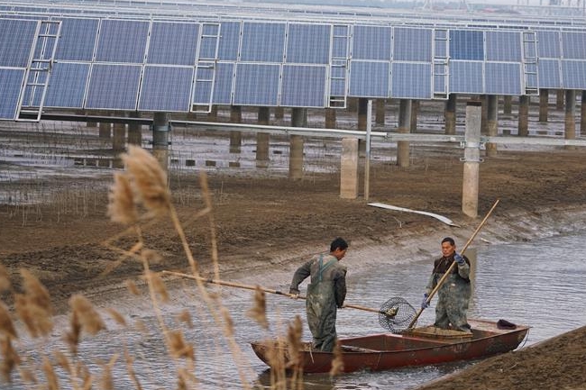 12月20日,在阜寧新能光伏電力有限公司30兆瓦漁光互補(bǔ)光伏發(fā)電項(xiàng)目現(xiàn)場,漁民在捕魚。阜寧新能光伏電力有限公司30兆瓦漁光互補(bǔ)光伏發(fā)電項(xiàng)目位于江蘇鹽城市阜寧縣陳集鎮(zhèn)大劉村,占地約1016畝,上層用于光伏發(fā)電,下層水面用于水產(chǎn)養(yǎng)殖。該項(xiàng)目于2013年并網(wǎng)發(fā)電,運(yùn)營期25年,根據(jù)當(dāng)?shù)貧庀髼l件,運(yùn)營期內(nèi)平均每年可發(fā)電3116萬千瓦時(shí),每年可節(jié)約標(biāo)煤約9504噸。水面由當(dāng)?shù)貪O民進(jìn)行水產(chǎn)養(yǎng)殖,年利潤達(dá)到200多萬元,取得了良好的社會(huì)效益、環(huán)境效益和經(jīng)濟(jì)效益。