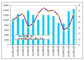 圖1 2015年12月-2016年12月多晶硅進(jìn)口量及進(jìn)口均價(jià)示意圖 數(shù)據(jù)來源:海關(guān)