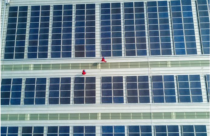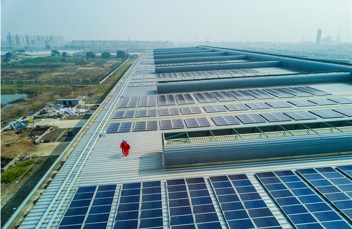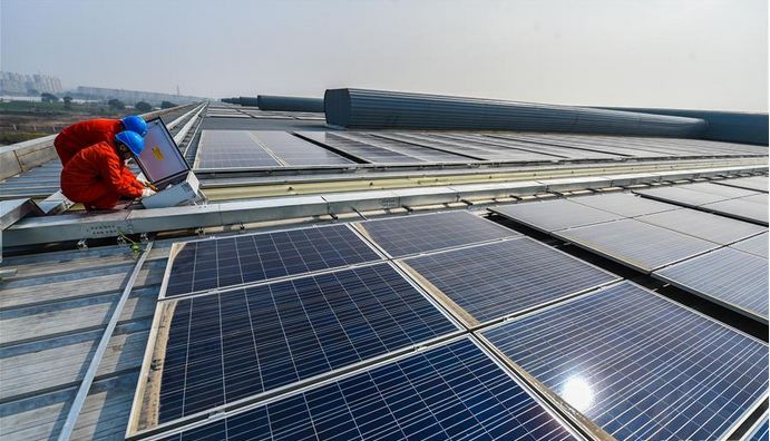 3月8日,工作人員在德清縣臨杭工業(yè)園區(qū)浙建鋼結(jié)構(gòu)光伏發(fā)電項目屋頂,檢查剛剛并網(wǎng)的光伏發(fā)電設(shè)備。新華社記者 徐昱 攝