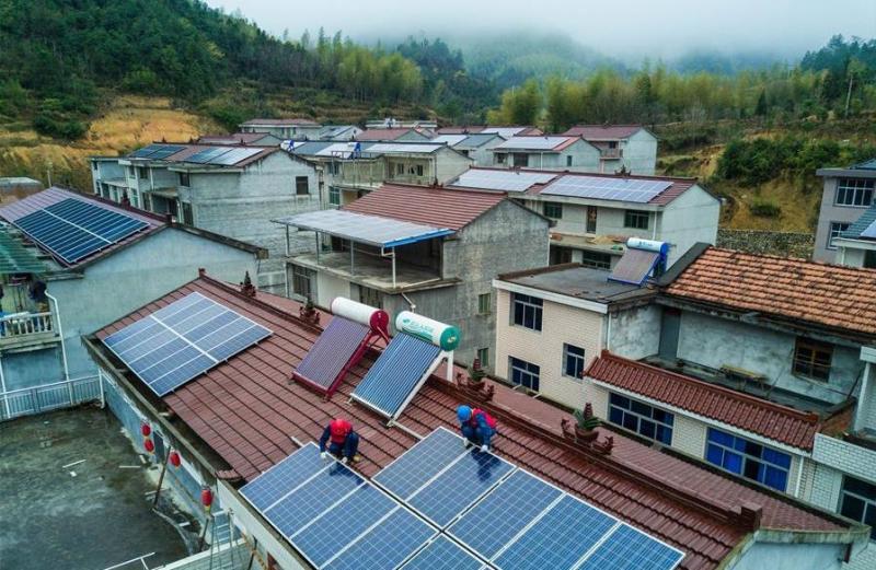 3月31日,工作人員在磐安縣盤峰鄉(xiāng)大嶺頭村的一戶居民樓頂檢查剛剛并網(wǎng)的光伏發(fā)電裝置。