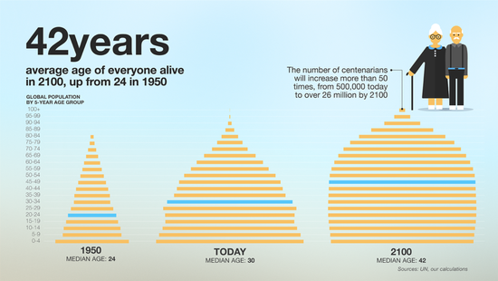圖:42歲——2100年所有人平均年齡為42歲,而1950年僅為24歲,百歲以上老人數(shù)量會增加50倍以上