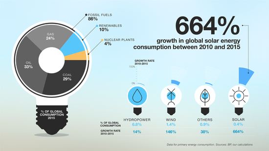 圖:664%——在2010年到2015年之間,全球太陽能消費(fèi)增長664%