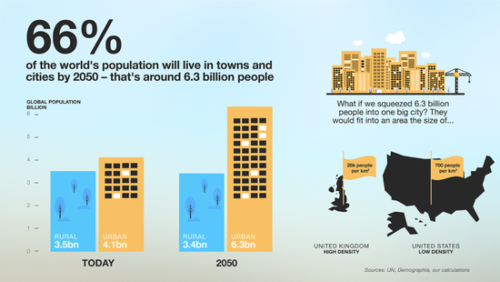 圖:66%——2050年66%的世界人口會住在城市中,相當(dāng)于63億人