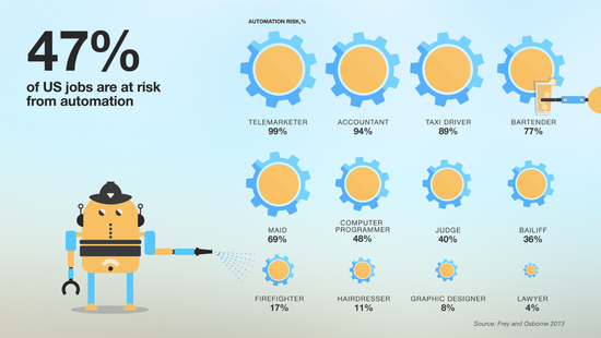 牛津大學(xué)研究人員預(yù)計(jì),美國半數(shù)工作崗位將被機(jī)器人或計(jì)算機(jī)取代。但是相對來說,有些工作可能更容易被自動化取代。在未來10年到20年間,電話銷售員、會計(jì)以及出租車司機(jī)都可能被取代,而需要創(chuàng)造性、手工靈巧或移情作用的工作則會堅(jiān)持更長時間。未來的勞動力市場必須適應(yīng)自動化帶來的壓力。