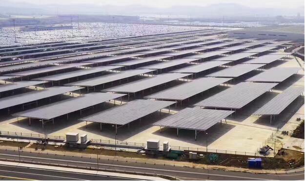 為突破這一瓶頸,上汽安悅節(jié)能將目光放在開發(fā)整車廠成品車停車庫上。這種在成品車停車庫建光伏車棚的技術(shù),是在每個(gè)車棚下面裝上一個(gè)匯流箱,車棚頂端的太陽能電板將吸收的電量統(tǒng)一收納,再經(jīng)過傳輸至逆變器將直流電變?yōu)榻涣麟姡詈笸ㄟ^增壓器將電壓變?yōu)?0千伏,即可輸送至電網(wǎng)內(nèi),完成發(fā)電。利用VDC停車庫廣闊的場(chǎng)地資源承載分布式光伏發(fā)電,不僅能有效解決光伏發(fā)電落地問題,還能將原本閑置的大面積停車庫場(chǎng)地資源有效利用起來,達(dá)到經(jīng)濟(jì)效益最大化。上汽安悅節(jié)能技術(shù)有限公司總經(jīng)理趙新紅表示,“汽車企業(yè)它有廣闊的廠房屋頂,整車廠都很大,還有很大的VDC停車庫,我們首創(chuàng)在VDC停車庫里面把光伏車棚搭好,打開了一片分布式光伏場(chǎng)地,解決了它的落地問題!
