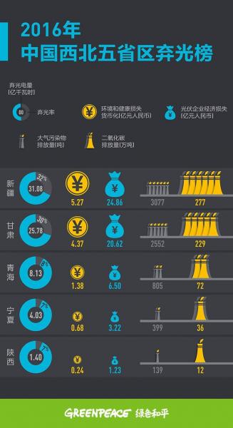 中國(guó)綠色和平組織近日發(fā)表了一份針對(duì)中國(guó)大陸內(nèi)蒙、新疆、甘肅、寧夏、青海等西北五省之棄風(fēng)與棄光限電問題調(diào)查的報(bào)告,報(bào)告指出,西北五省的限電問題日趨嚴(yán)重,棄光在2016年就造成相關(guān)企業(yè)的經(jīng)濟(jì)損失達(dá)56億元(人民幣,下同)。