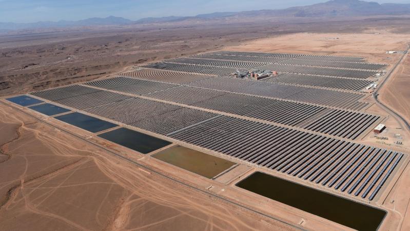 施工現(xiàn)場(chǎng)是1430公頃的荒漠地帶,65萬塊光伏鏡面裝置整齊鋪設(shè),巨大的熔鹽罐和集熱塔分布其間。