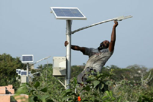 印度金奈一公園的工作人員正在安裝太陽能路燈(路透社)